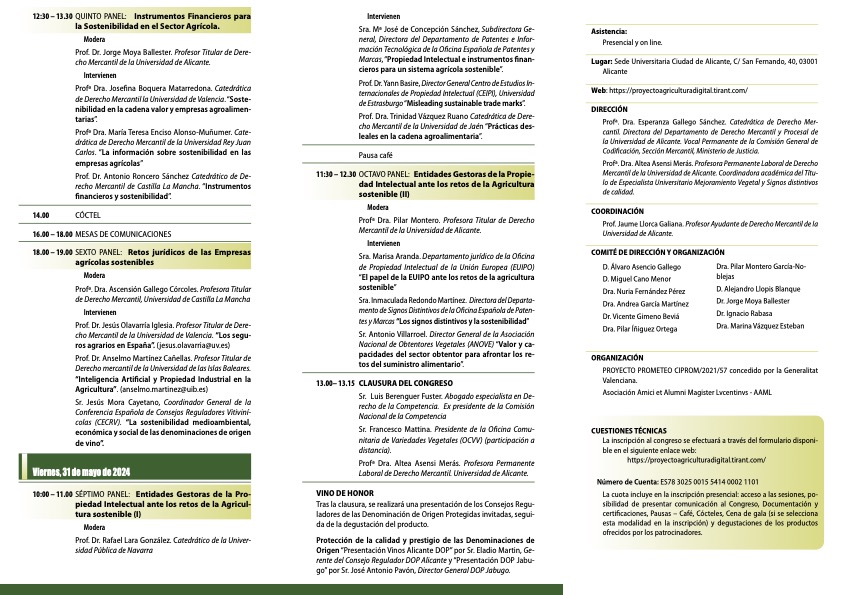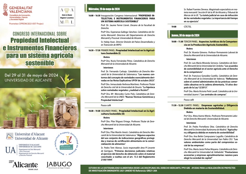 El Departamento de Derecho Mercantil y Derecho Procesal de la UA – Universidad de Alicante / Universitat d’Alacant de Alicante y el Máster en Propiedad Intelectual e Innovación Digital Magister Lvcentinvs se complacen en anunciar el próximo «Congreso Internacional sobre Propiedad Intelectual e Instrumentos Financieros para un Sistema Agrícola Sostenible«, que se llevará a cabo del 29 al 31 de mayo de 2024 en la prestigiosa Sede Universitaria Ciudad de Alicante, ubicada en C/ San Fernando, 40, 03001, Alicante.