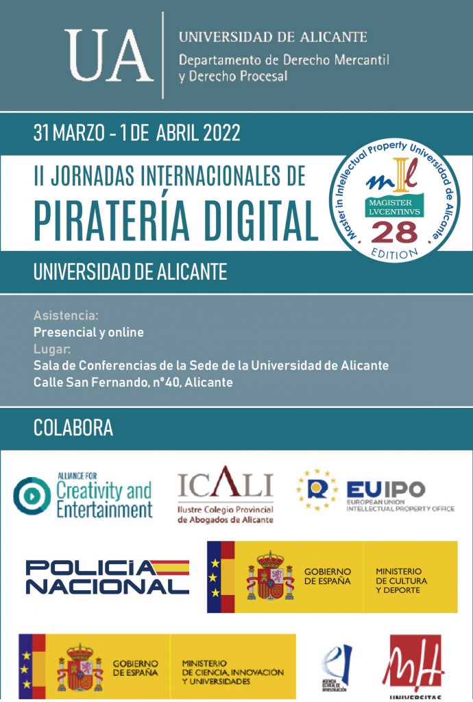 Esta semana se celebrará en la Universidad de Alicante la 2ª edición de las Jornadas de Piratería Digital, organizadas por el Departamento de Derecho Mercantil en el marco del Magister Lvcentinvs, Máster en Propiedad Intelectual e Innovación digital de la Universidad de Alicante.